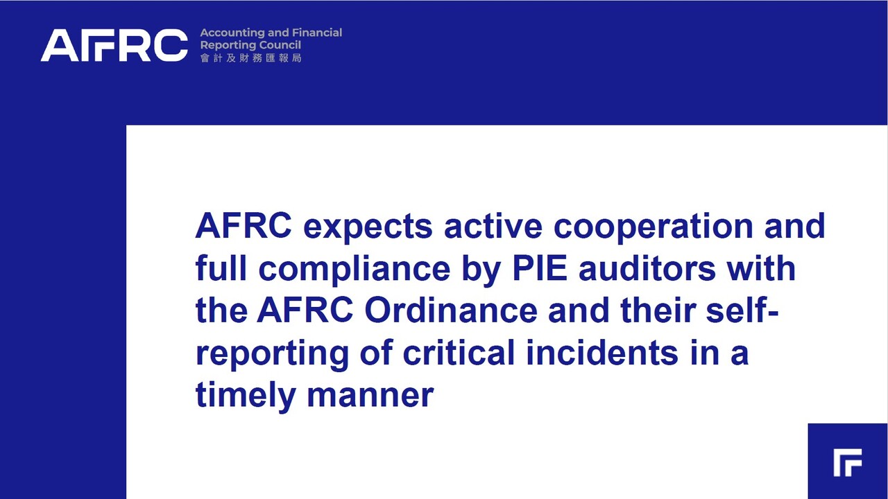 The Accounting and Financial Reporting Council (AFRC) reiterates, as the independent regulator of the accounting profession in Hong Kong, that it expects all PIE auditors and registered responsible persons to fully comply with the Accounting and Financial Reporting Council Ordinance (AFRCO) and report to the AFRC in a timely manner any critical incidents in relation to audit quality and the firms’ systems of quality management.