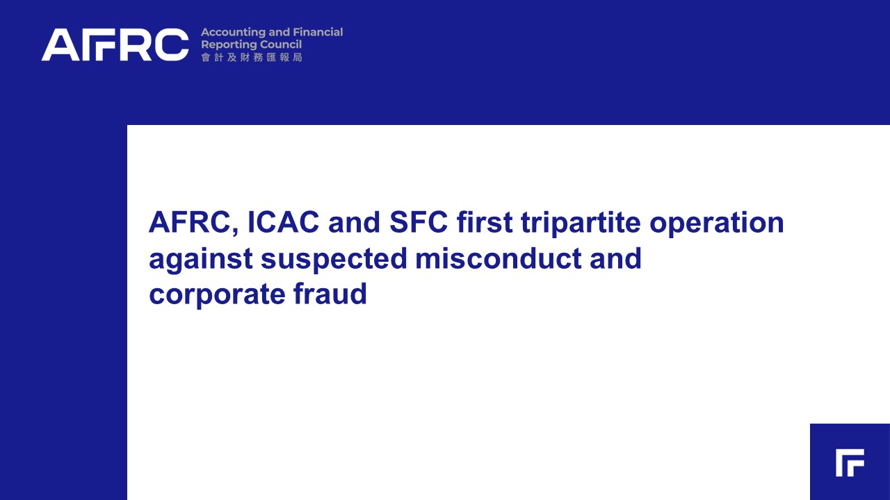 The Accounting and Financial Reporting Council (AFRC), the Independent Commission Against Corruption (ICAC) and the Securities and Futures Commission (SFC) conducted the first tripartite joint operation (Joint Operation) involving two Hong Kong-listed companies on suspicion that they falsified corporate transactions totalling HK$193 million (approximately RMB177.56 million).